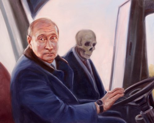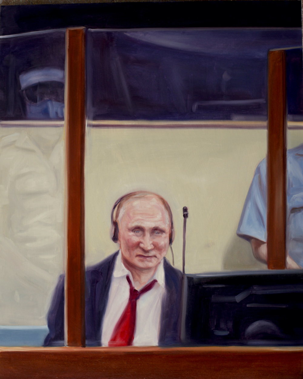 Ateljeessa on lattialla kuivumassa tai muuten vain valmiina kymmeniä tauluja. Useimmissa niissä on Venäjän diktaattori Vladimir Putin, mutta löytyy myös ulkoministeri Lavrovia, Yhdysvaltain ex-presidentti Trumpia ja onpa jokunen Suomen poliitikkokin päässyt kuvaan. Mutta ennen kaikkea Putin. Hän istuu Haagissa surkeannäköisenä, katsoo peiliin ja Hitler katsoo takaisin, on piiloutunut vessanpönttöön. Ja niin edelleen.